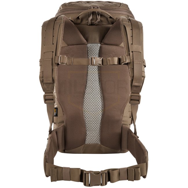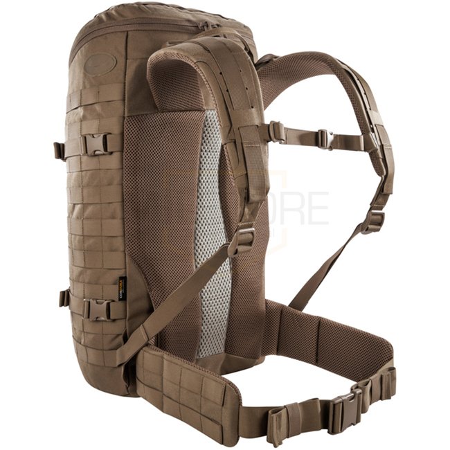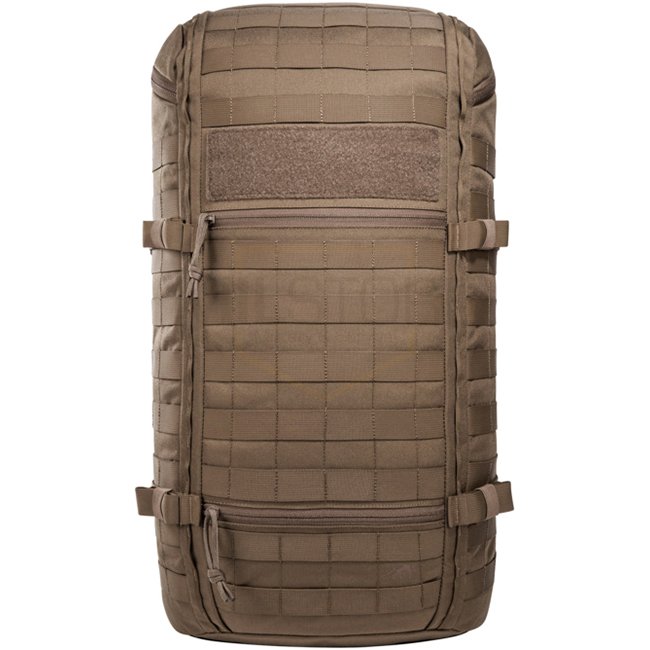 The lid contains an integrated zip pocket and an additional inner pocket. Inside are flat mesh compartments and a large hook-and-loop MOLLE panel for individual organisation. Externally, the pack offers two front zippered pockets, a Daisy Chain, and a hook-and-loop area for identifiers. MOLLE layout: lid 6 × 4 loops, sides 5 × 9, front 6 × 7. This ensures maximum modularity in a compact form.