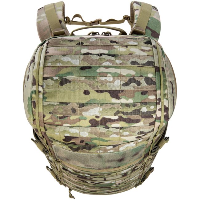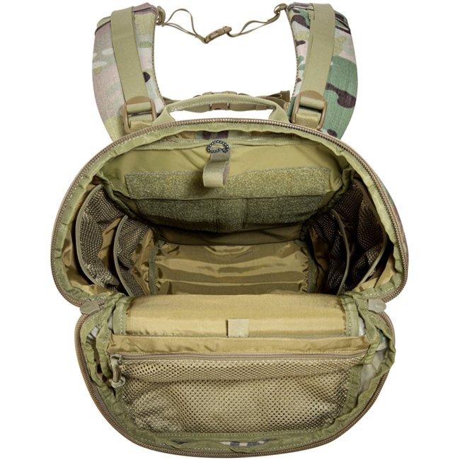 The lid integrates a zippered pocket and an additional inside compartment. The interior provides flat mesh pockets and a large MOLLE hook-and-loop panel for customized organization. On the outside, two zippered front pockets, a Daisy Chain, and a hook-and-loop panel for identification patches increase versatility. The MOLLE areas are systematically divided: Lid 6 × 4 loops, sides 5 × 9, front 6 × 7. This ensures maximum modularity in a compact design.