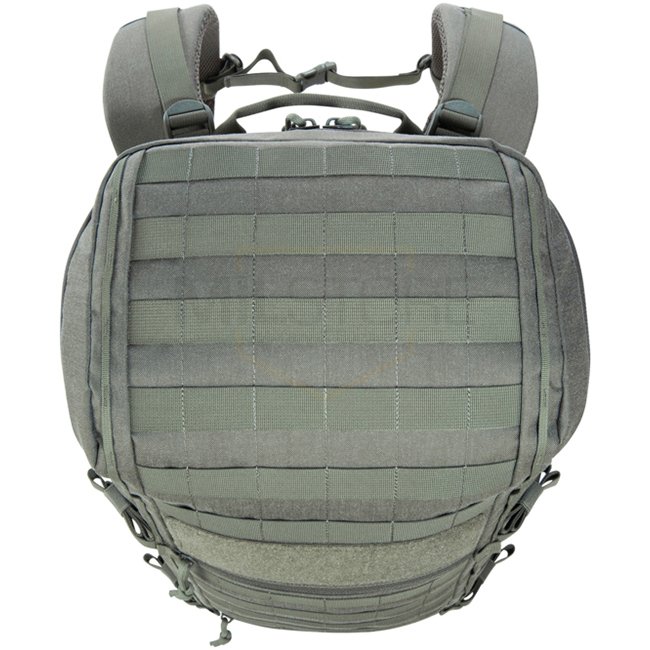 The lid includes an internal zippered pocket and the main compartment includes flat mesh pockets and a large hook-and-loop panel for tailored organisation. Front Daisy Chain and MOLLE surfaces cover the lid (6 × 4 loops), sides (5 × 9 loops) and front panel (6 × 7 loops), providing maximum flexibility for mission-specific add-ons.