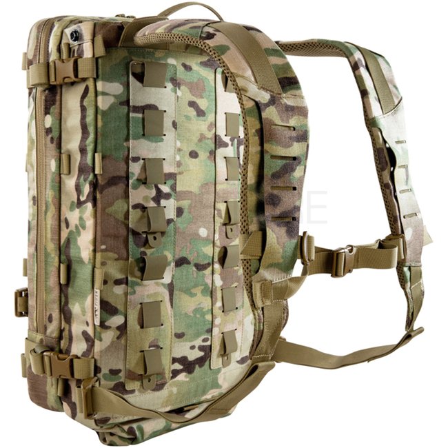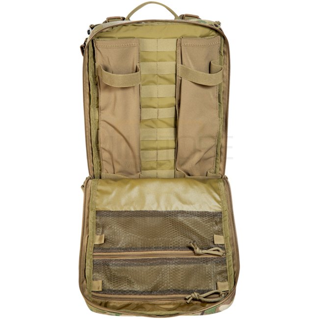 The front compartment opens fully and can be fixed in two positions. Inside are elastic pockets, mesh pouches and the removable tool tubes. Padded, removable shoulder straps and additional carry handles allow flexible use. Its slim profile reduces side bulk and ensures maximum mobility during operations.
