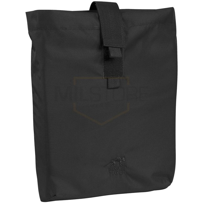 Tasmanian Tiger Dump Pouch in Black. Small, foldable design with easy one-hand operation. Perfect for storing 4-6 rifle magazines. Dimensions: 21 x 20 cm.