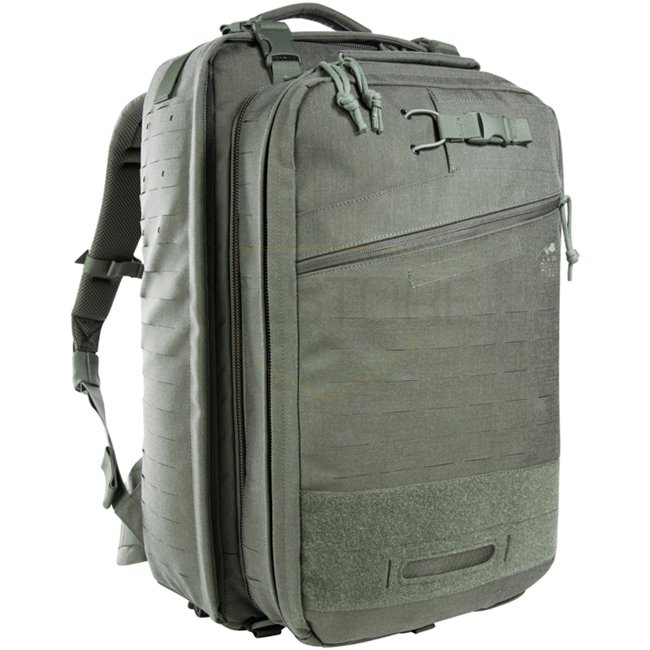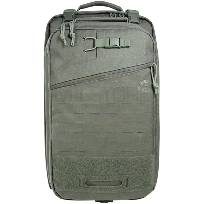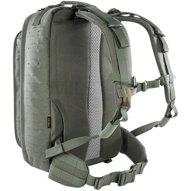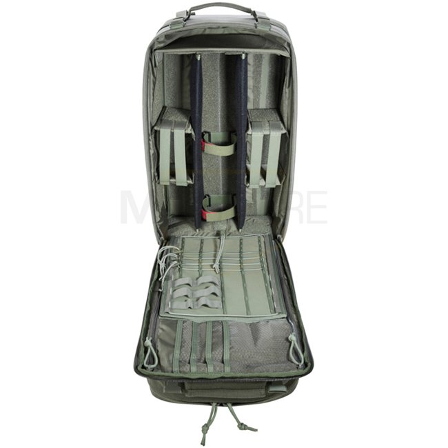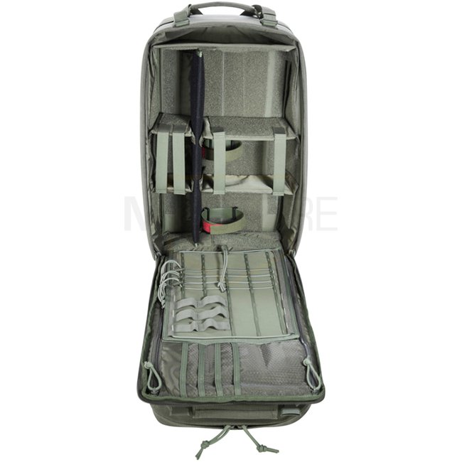 This system combines two packs in one: the front pack detaches and may be worn separately for mission adaptability. Inside are modular hook-and-loop partitions designed for medical supplies, such as a 2 l oxygen cylinder Ø 100 mm, length 430 mm. Laser-cut MOLLE System on front and sides allows modular attachments.