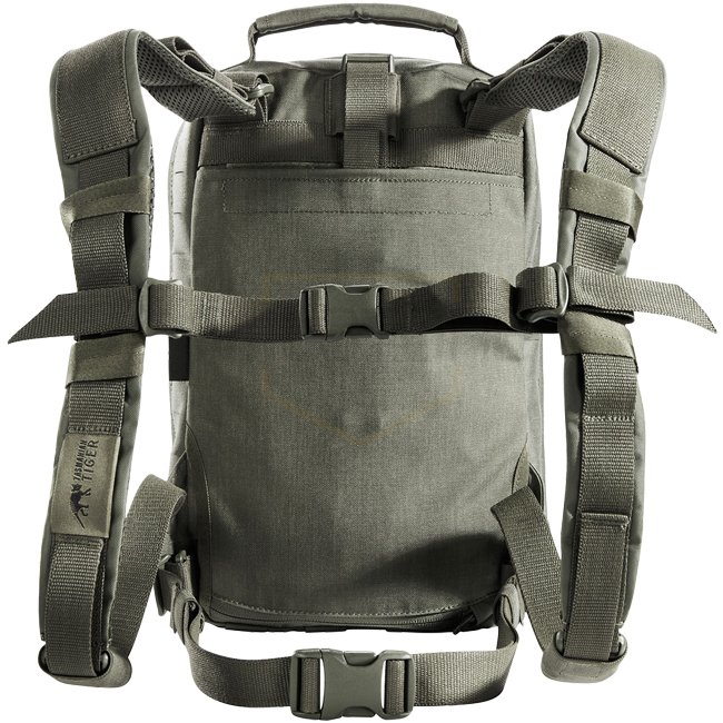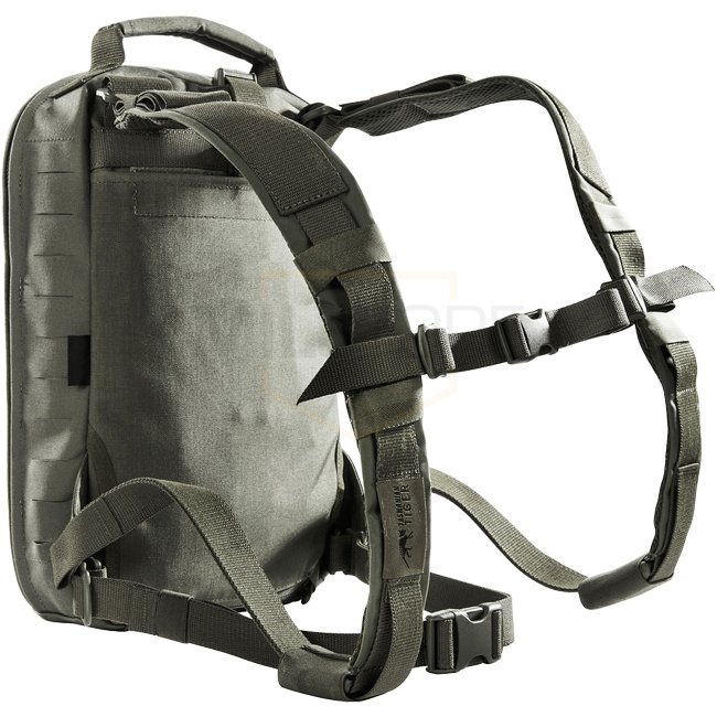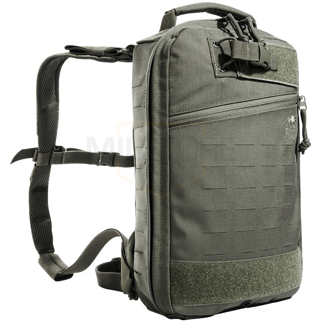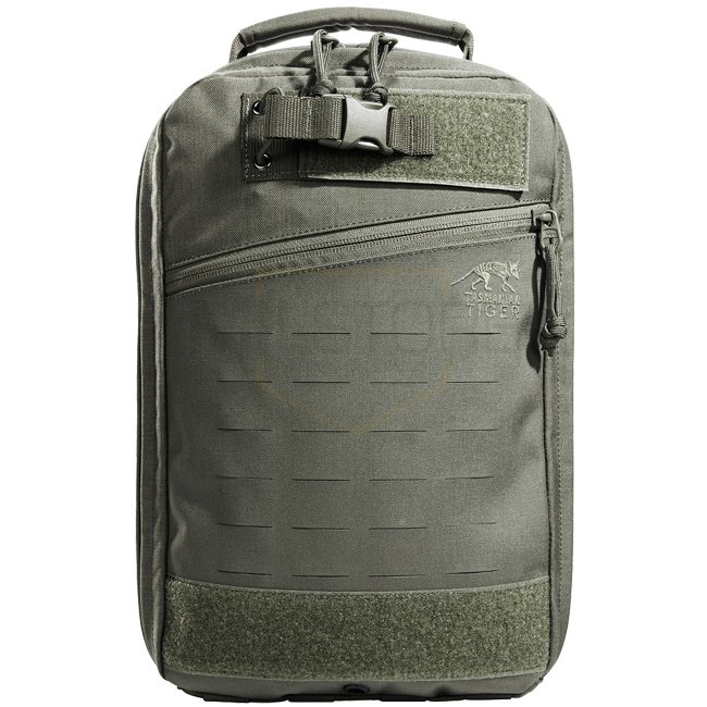 Small flat Medic backpack with intelligent, clearly laid-out interior. The MOLLE system on the front and sides is laser cut. The shoulder straps can be removed and kept in a hook-and-loop-secured pouch on the back. The backpack comes with webbing so it can be adapted to a plate carrier or waistcoat. Specially designed for use on plate carrier systems. Made of CORDURA® and material with IRR treatment. Both the European CORDURA® materials as well as web-bing, hook-and-loop fasteners and buckles meet the high German Bundeswehr standards TL 8305-0278 and TL 8305-0281 with regard to the IRR camouflage effect (IRR 650 – 1250nm / 10 – 42%).