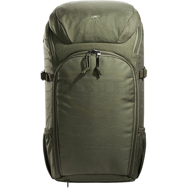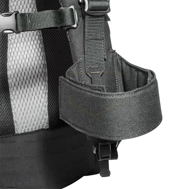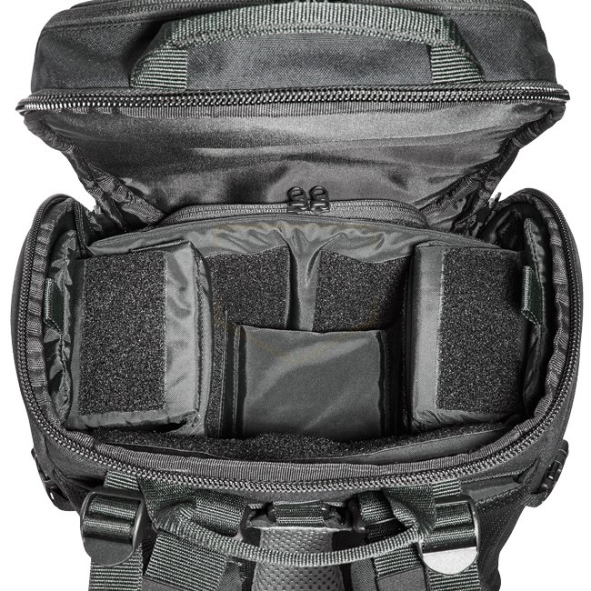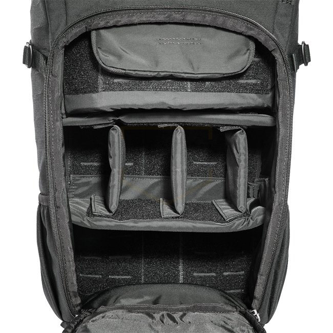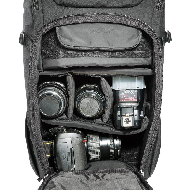 Modular backpack conceived as a camera and documentation pack. The focus here is on comfort and usability. The main compartment features front access and an extra top opening so you can quickly grab your camera. The interior of the backpack has adjustable partitions for cameras and lenses; the partitions can of course be removed completely. A little organizer pocket for memory cards and filters can also be removed. The backpack has a lid pocket and deep side pockets that are meant to hold a tripod and can be secured with lateral compression straps. Laser-cut MOLLE on the sides and front can be used to add gear as you see fit. The padded back panel system, which includes the padded hip belt, makes the backpack super comfortable to carry. The hip belt with laser-cut MOLLE can also be used to attach accessories, for example lens pouches, and can be removed at any time. The shoulder strap also has a camera fastener. The rain cover in the bottom pouch of the backpack completes the list of features.
