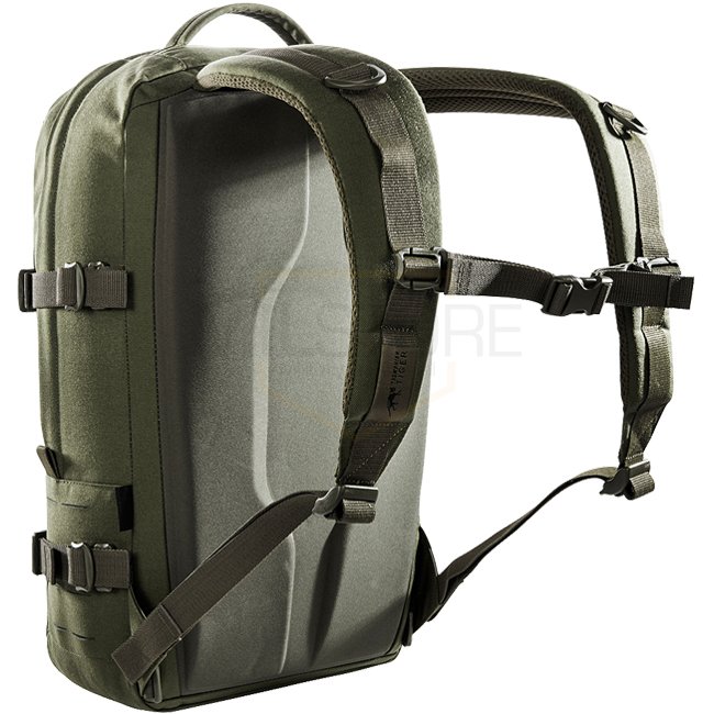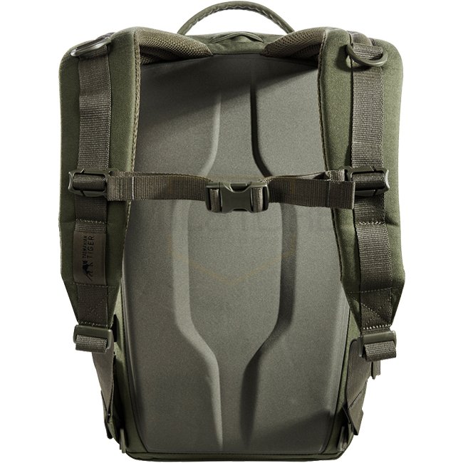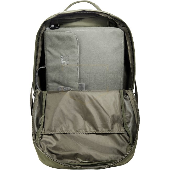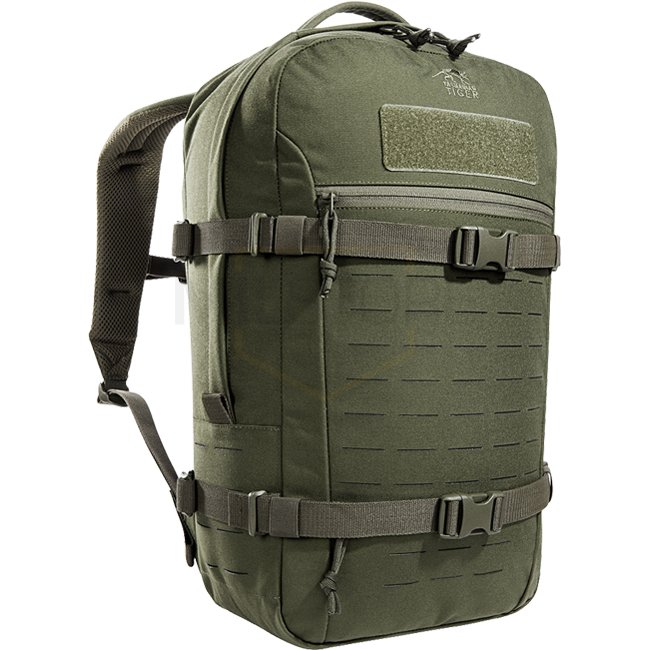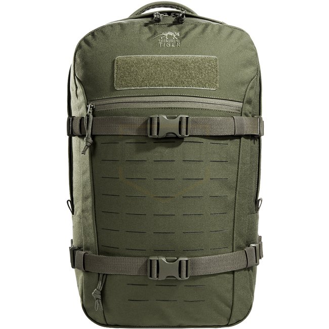 Tasmanian Tiger Modular XL Daypack in Olive. 23L volume with MOLLE compatibility for loop pouches. Fits 15.4" laptop, featuring various pockets and laser-cut MOLLE system for customization.
