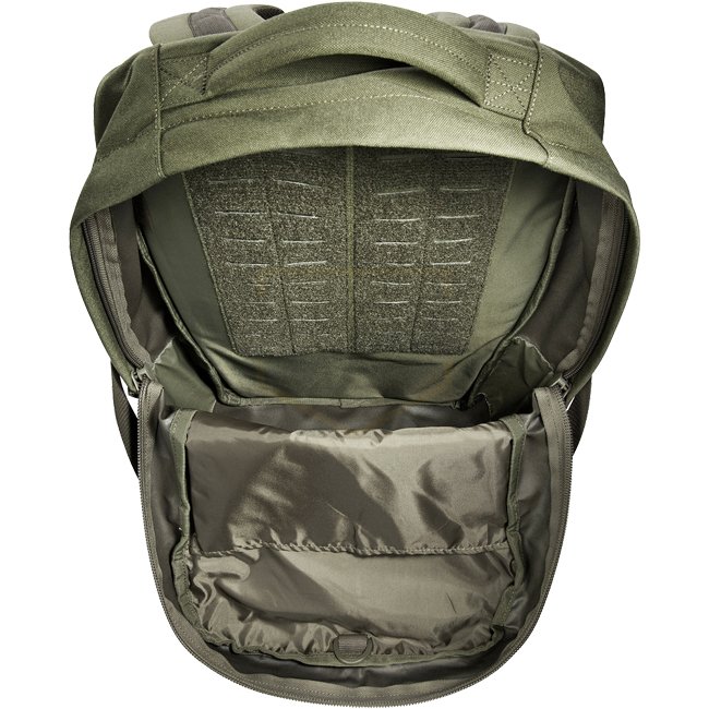 Modular daypack with 23 liters of volume. The backside of the main compartment of the daypack is lined with MOLLE hook panels for attaching compatible loop pouches. It is also designed to hold a 15.4? laptop. The flat zipper front pocket is great for documents while the laser-cut MOLLE on the front and sides allow you to add gear to suit your needs.