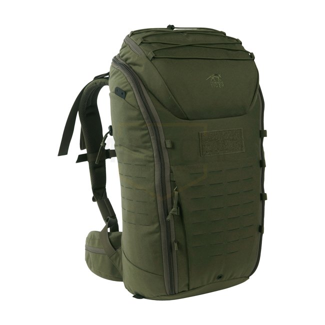 Tasmanian Tiger Modular Pack 30 - Olive. Modular universal combat backpack. Lid pocket and laser-cut MOLLE on sides and front. Front opening pulls up completely. Velcro sections for individual features. Detachable hip fins. Comes with accessories pouches