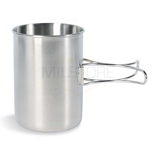 Stainless steel mug with folding handles, Tatonka Handle Mug 850, 850 ml volume, practical folding handle, suitable for Nalgene bottle, made of 18/8 stainless steel, foldable handle, measuring scale, food-safe, 10 x 13.5 cm, 0.85 l volume, 210 g weight.