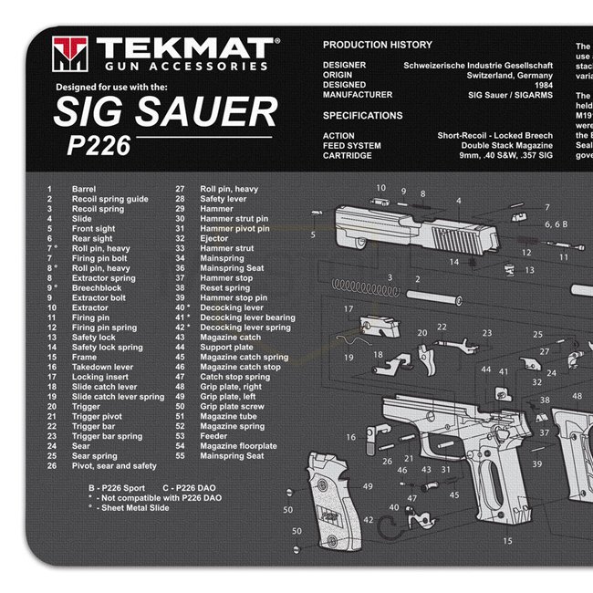 TekMat Cleaning & Repair Mat - SIG P226: Ideal weapon maintenance mat also great for work or desktop use with a slim 3mm thickness. Dimensions: 43 x 28cm.