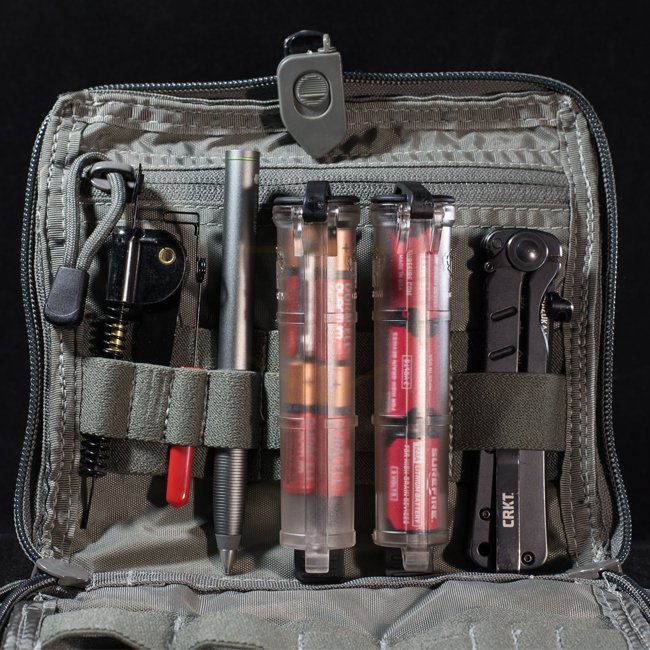 • First aid gear including hemostatic clotting agents, tweezers, and bandages