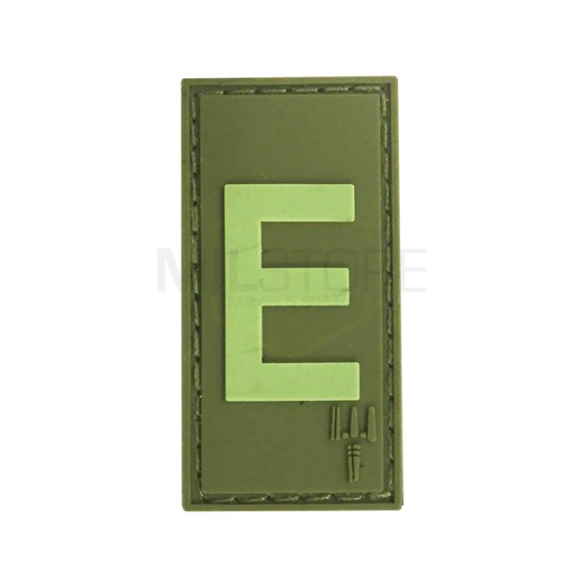 Écusson Pitchfork Lettre E - Olive. Dos velcro. Dimensions : 50 x 25mm.