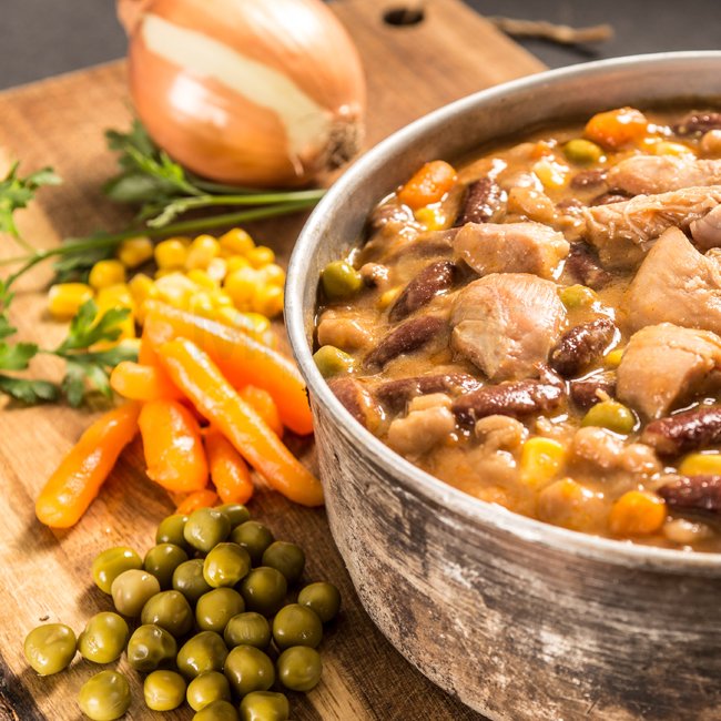 Composition: Viande de cuisse de poulet (30%), légumes (maïs, pois, carottes), haricots (20%), oignons, farine de riz, farine de maïs, huile de colza, sel, paprika, poivre, piment