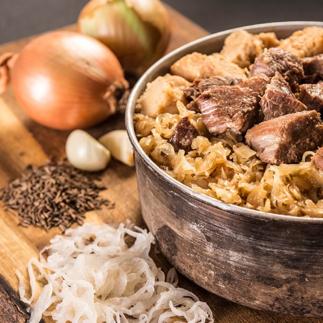 Composition: Épaule de porc (30%), chou fermenté, huile de tournesol, oignons, farine de blé, sucre, ail, vinaigre, sel, cumin et poivre. Boulettes de pommes de terre : pommes de terre, farine de blé, semoule de blé, œuf, sel