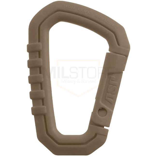 Carabine en polymère ASP de couleur coyote, fabriquée en matériau polymère léger. Mesure 90 mm de hauteur et supporte un poids allant jusqu'à 125 kg. Idéal pour des utilisations non liées à l'escalade. Veuillez noter : Ce connecteur Tac Link n'est pas not