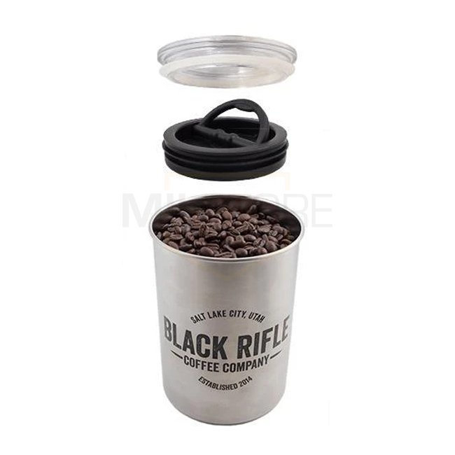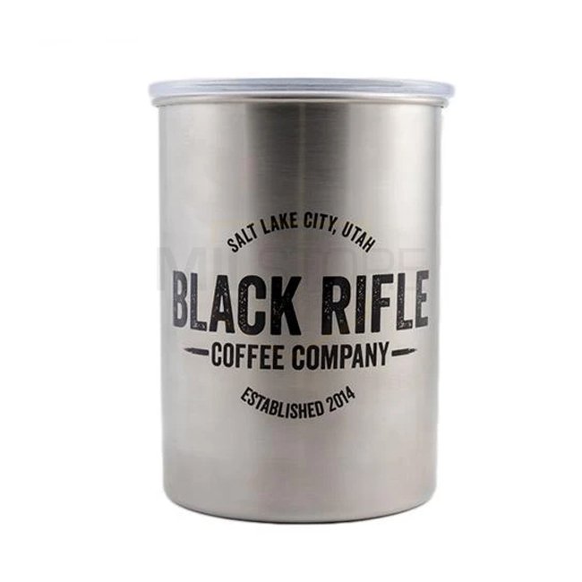 Gardez votre café Black Rifle frais et savoureux avec ce conteneur hermétique en acier inoxydable. Dimensions : 165 x 127 x 127 mm.
