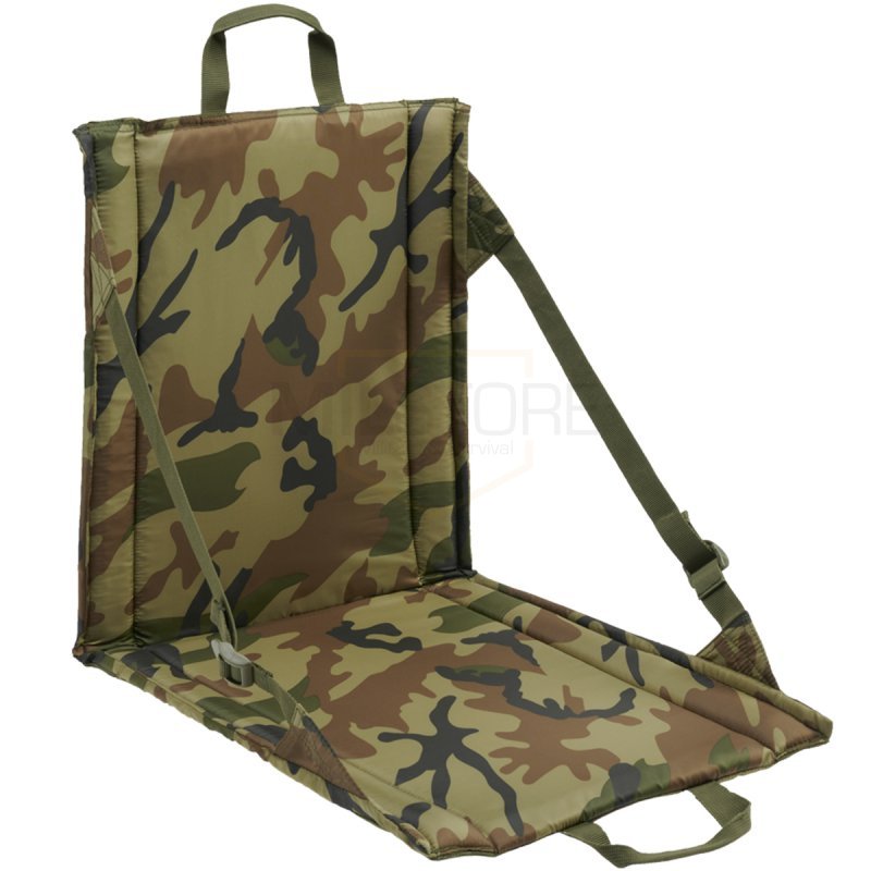 Siège pliable Brandit - Woodland : Siège pliable avec dossier, idéal pour le camping, les festivals, la randonnée, les vacances à la plage ou la vie quotidienne. Dispose de poignées stables, de fermetures velcro, d'un dossier réglable et d'un matériau en