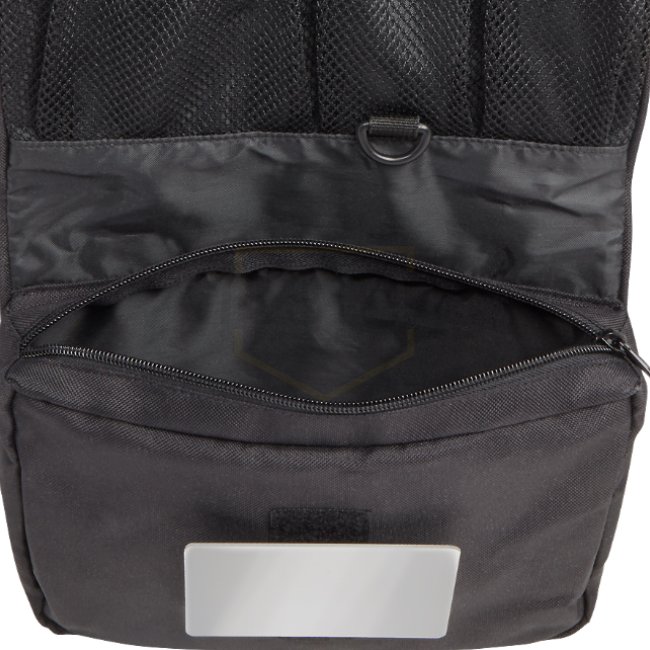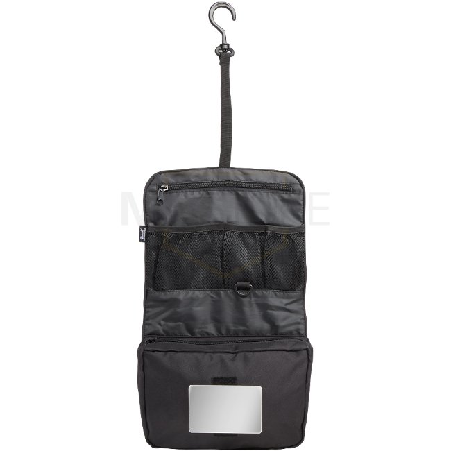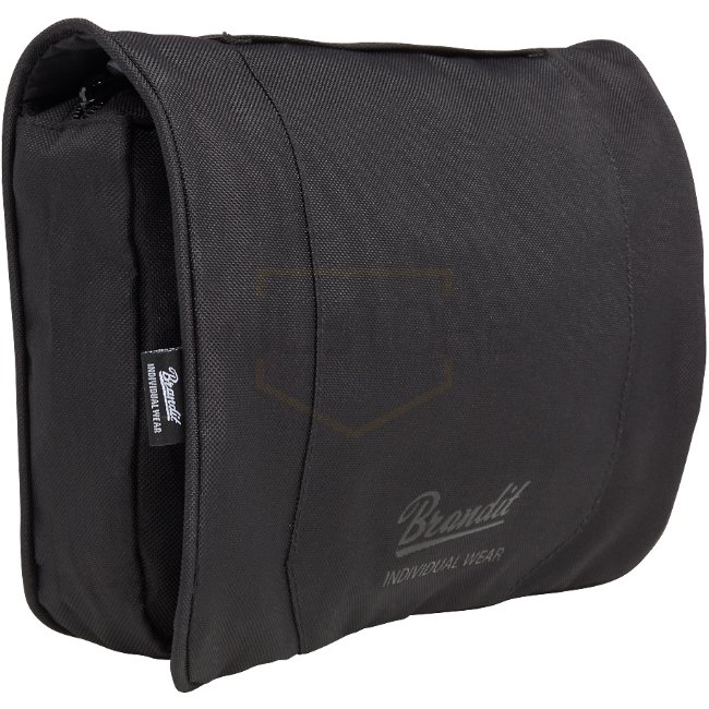 Un pratique sac de toilette Brandit de grande taille en noir classique. Comprend un compartiment zippé, deux poches en maille avec bande élastique, un grand compartiment dépliant avec fermeture éclair, un miroir incassable détachable, une surface en Velcr
