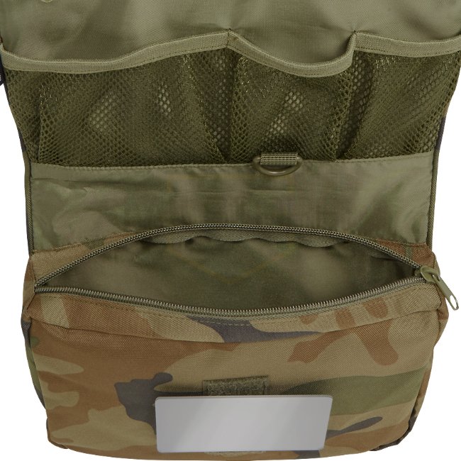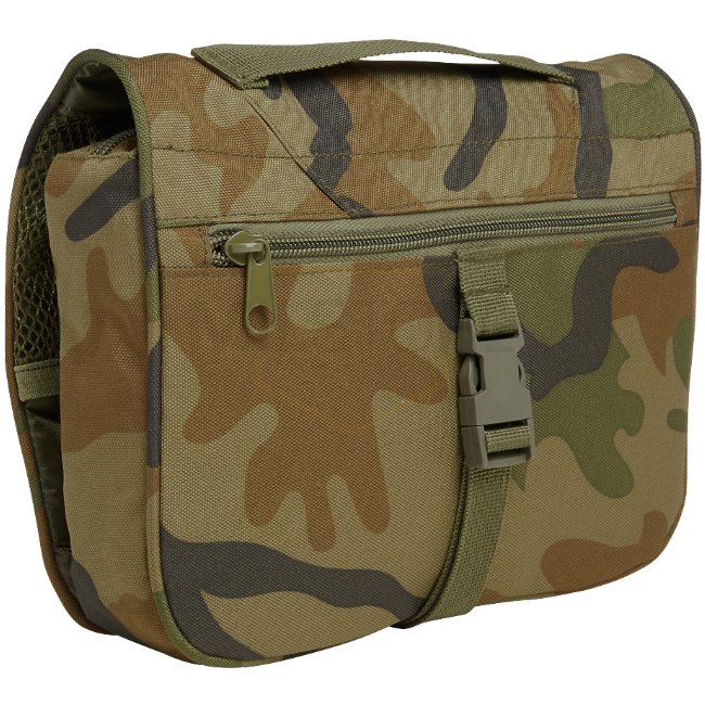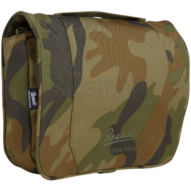 Restez organisé en déplacement avec le sac de toilette Brandit en grand modèle et design Woodland. Dispose de plusieurs compartiments, d'un miroir amovible et d'un crochet de suspension pour plus de commodité. Construction durable avec verrou à boucle et