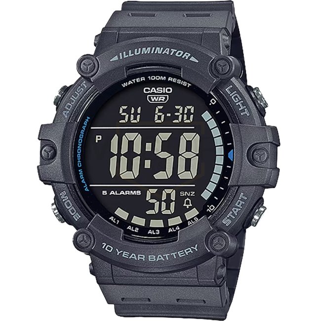 Casio Illuminator Max - Gris Foncé : Un design audacieux allié à une lisibilité pratique avec le Casio Illuminator Max. Grand affichage numérique pour une lecture facile de l'heure, de la date et des fonctions chronomètre. Batterie longue durée de 10 ans