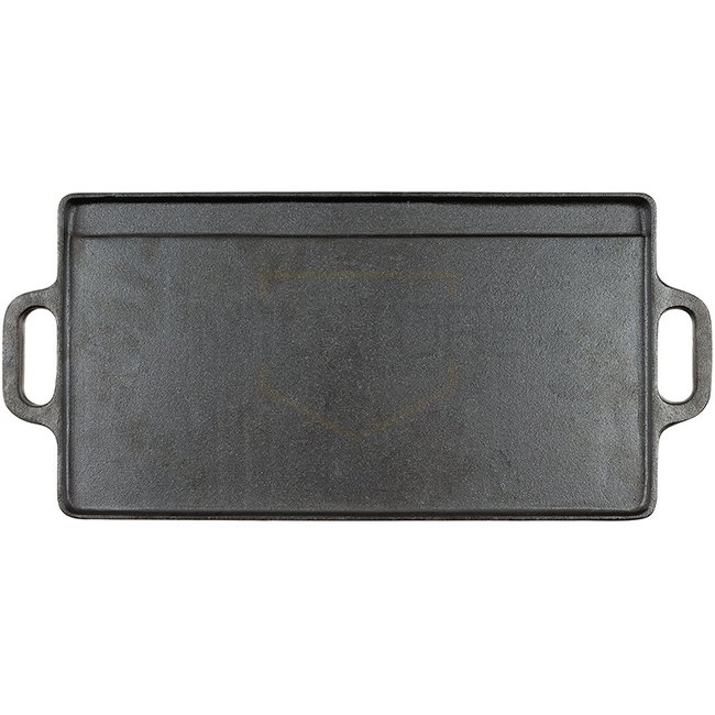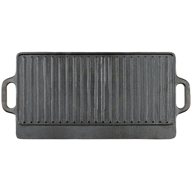 Grille en fonte avec surfaces de cuisson réversibles, côté lisse avec bac de récupération et surface de grillade rainurée. Comprend 2 poignées. Dimensions : 50 x 23 x 1,5 cm. Fabriqué en fonte à 100 %. Parfait pour la cuisson intérieure et extérieure.
