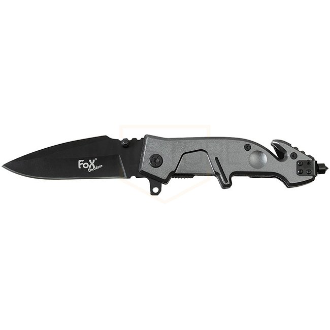 Couteau pliant FoxOutdoor à une main - Gris : Lame noircies avec un bord lisse, épingle pouce double face et ouvreur à soufflet dans une poignée en métal avec coupe-ceinture et brise-verre. Forme ergonomique pour une prise en main sécurisée. Longueur tota