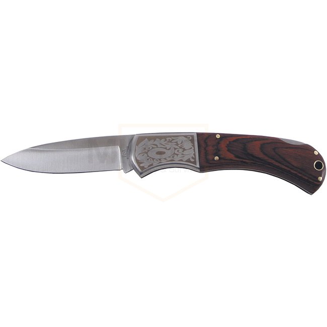 Couteau pliant FoxOutdoor Bois & Ornements - Argent : Couteau élégant avec un mécanisme de verrouillage, lame à bord lisse, manche en métal orné et plaques de prise en bois. Longueur totale 21 cm, lame 8,5 cm, poids 160 g.