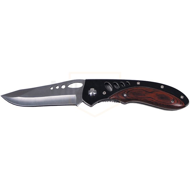 Couteau pliant FoxOutdoor avec insert en bois - Noir : Lame avec un bord lisse et des perforations pour une ouverture facile. Linerlock, poignée en métal avec inserts en bois (le grain et la couleur du bois peuvent varier). Forme ergonomique, longueur tot