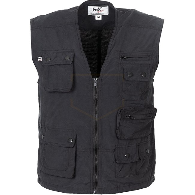 Gilet Outdoor Microfiber FoxOutdoor - Noir - 2XL. Fermeture éclair à l'avant, poches multiples, taille réglable, doublure en filet. 70 % Coton, 30 % Nylon.