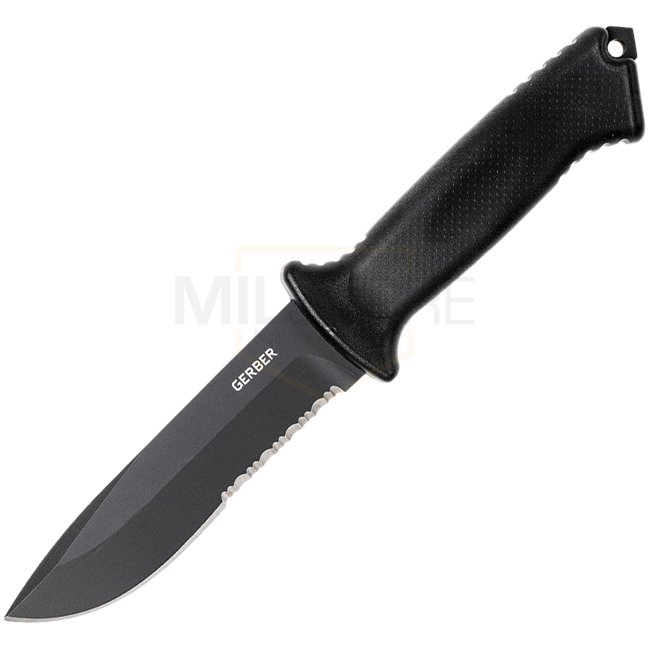 Couteau dentelé Gerber Prodigy - Noir : Lame en acier inoxydable 420HC compacte et durable avec manche en plastique. Pèse 204g, longueur de la lame 120mm, longueur totale 248mm.