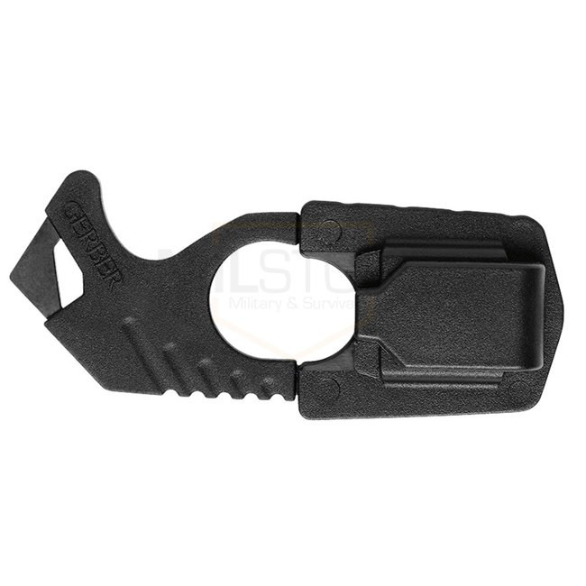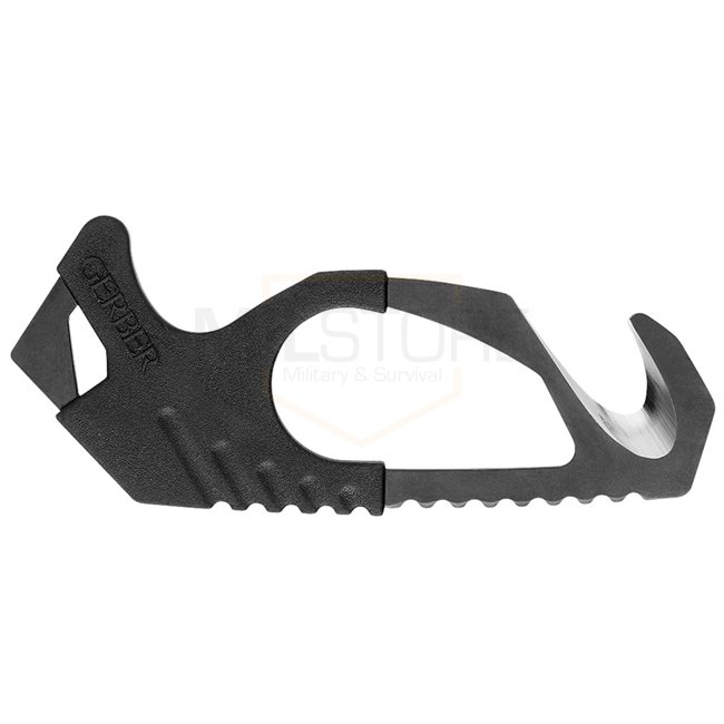 Couteau à sangle Gerber - Noir : Coupe des sangles en nylon et des ceintures de sécurité en quelques secondes. Lame à biseau unique, construction en acier inoxydable avec finition en oxyde noir. Bord arrière texturé, poigne en caoutchouc, casse-vitre, cro