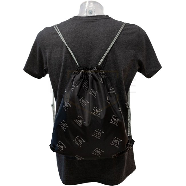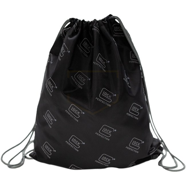 Sac de Gym Glock Réfléchissant : Sac de gym 100% polyester avec un motif de logo Glock réfléchissant, ayant des dimensions de 42 x 37 cm et un crochet de suspension gris.