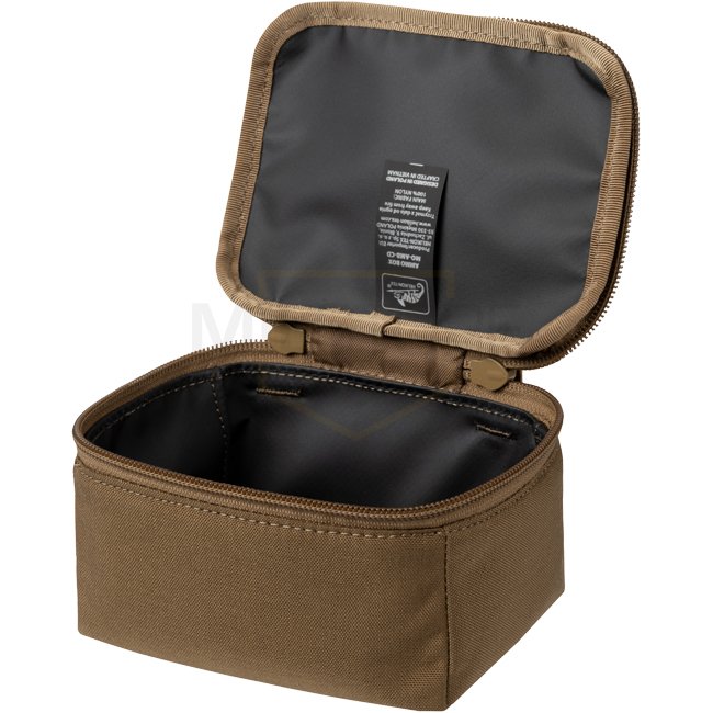 L'Ammo Box est utilisée pour stocker et transporter facilement des munitions d'armes à feu. Grâce à ses petites dimensions, il peut être transporté dans des sacs Rangemaster et Range, l'utilisant ainsi comme protection supplémentaire, ce qui est particulièrement important dans le cas de munitions chargées à la main. L'intérieur est doublé d'un tissu qui absorbe la saleté et est facile à nettoyer et la couche extérieure est en Cordura 500D durable. Il peut contenir trois packs de munitions standard de 9x19mm, mais vous pouvez également transporter des munitions à l'intérieur.