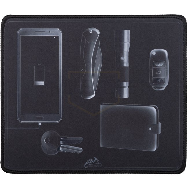 Tapis utilitaire Helikon-Tex EDC - Noir : Léger, facile à nettoyer, avec guide imprimé. Dimensions : 25.5 x 21.5 x 0.3 cm. Poids : 96 g. Fabriqué en néoprène.