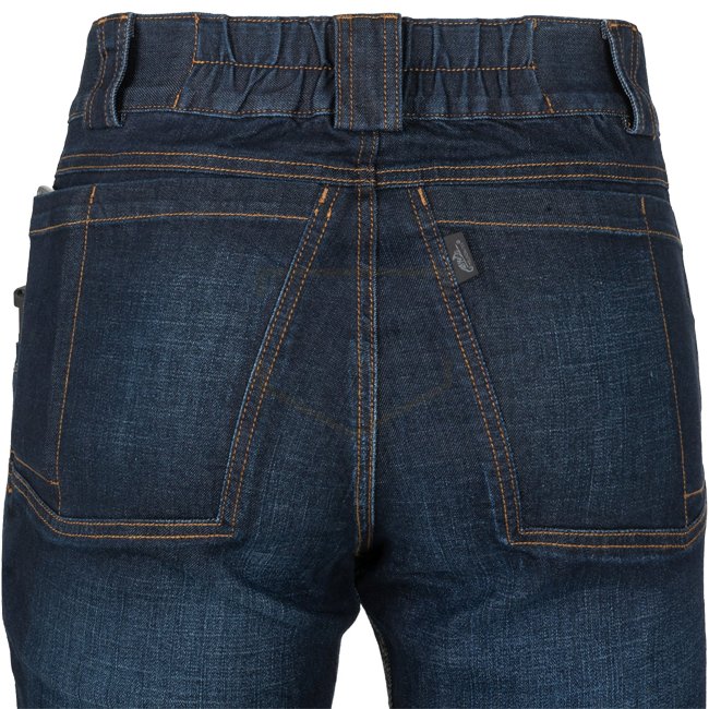 Jean tactique Greyman Slim de Helikon-Tex en denim bleu foncé moyen, 4XL - XLong. Version slim avec gousset à l'entrejambe pour un mouvement facile et une durabilité. Ceinture élastique avec fermeture à crochets et boucles, neuf poches pour les essentiels