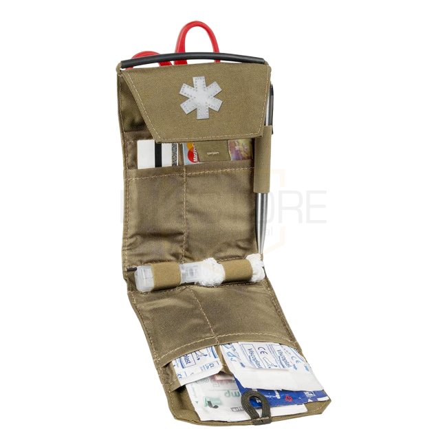 Le Pocket Med Insert est une petite trousse de premiers soins légère et plate qui se glisse dans la poche du pantalon. Il faudrait des articles de base, comme des gants, une carte à glace, un masque de réanimation, des pansements et des pansements, une bouteille de solution saline ou de petits cisailles pour traumatismes.