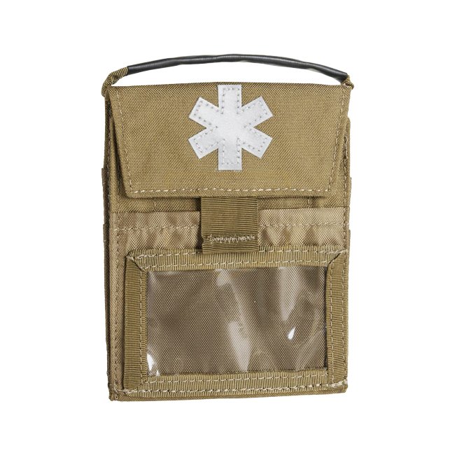 Helikon-Tex Pocket Med Insert - Coyote : Trousse de premiers soins légère pour poche de pantalon. Inclut des gants, une carte ICE, un masque de réanimation, des pansements, des bandages, une bouteille de solution saline, et plus encore.