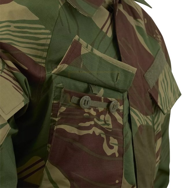 - Deux poches inclinées sur les épaules avec double système de fermeture (velcro et bouton canadien)