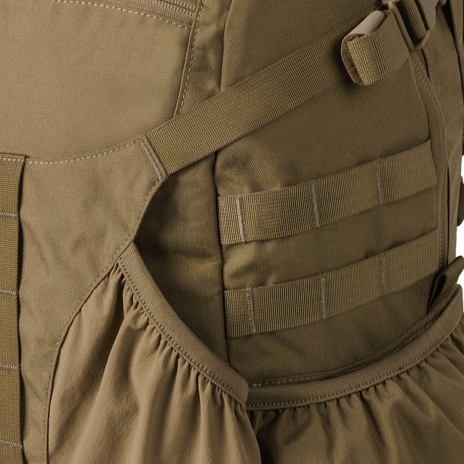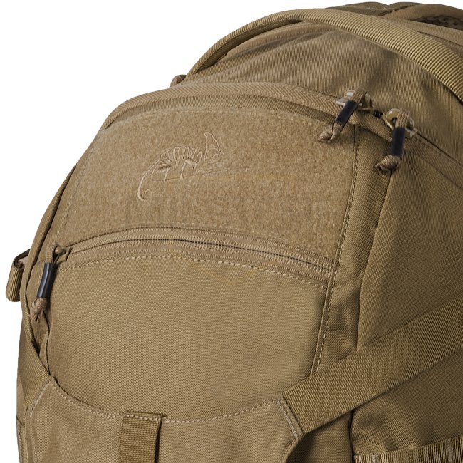 Sac à dos Helikon-Tex Raider de couleur coyote, fabriqué en tissu Cordura durable avec un panneau d'identification Velcro, une poignée de transport confortable et des bretelles anatomiques. Comprend un système MOLLE/PALS, des fermetures éclair YKK, un sup