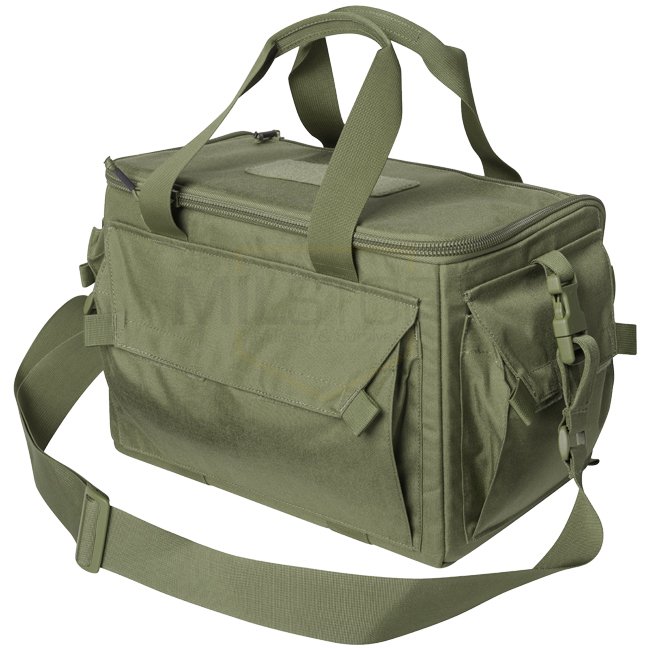 Sac de tir Helikon-Tex en couleur Olive, fabriqué en tissu Cordura durable avec une capacité de 18L. Comprend un compartiment principal avec doublure en velcro, fermetures éclair YKK, et des dimensions de 350x255x200mm. Pèse 1930g. Accessoires dans les im