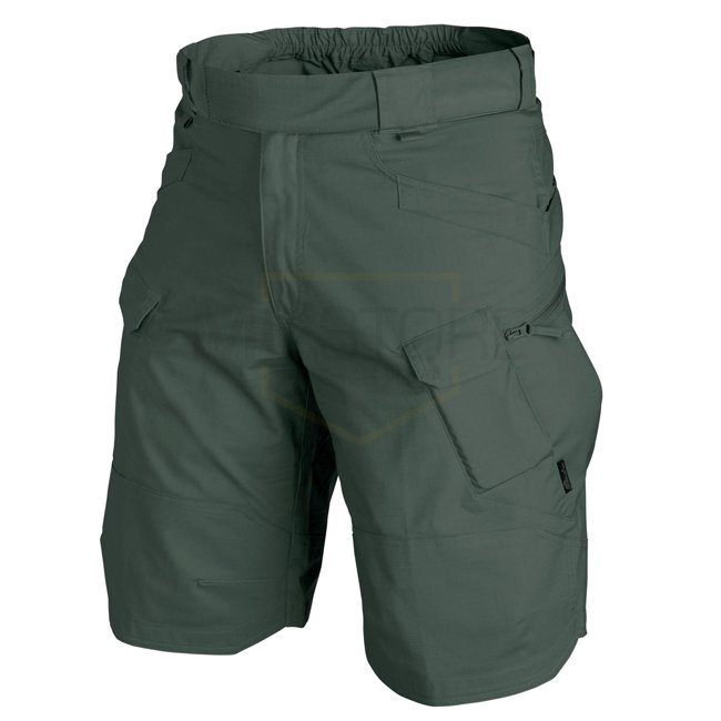 Shorts tactiques urbains Helikon-Tex UTS 11 en PolyCotton Ripstop vert jungle - S. Taille élastique, passants de ceinture de 50mm, boucles pour clés, poches arrière, poches cargo sur les cuisses, poches pour smartphone/recharge AR, fermeture éclair YKK.