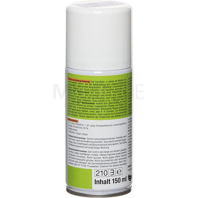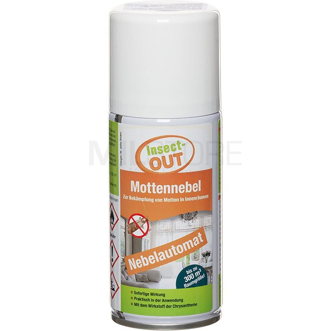 Brouillard Anti-Mite Insect-OUT 150 ml - Brouillard aérosol contre les mites pour des pièces jusqu'à 300 m¸. Contient Prallethrin, extrait de Pyrèthre, Acétone. Propulseur propane et butane.
