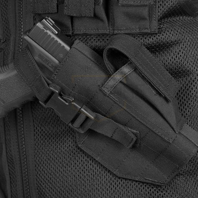 Un gilet noir réglable et polyvalent avec étui croisé, comportant plusieurs poches pour 4 chargeurs 5.56, 4 chargeurs de pistolet, et 1 pistolet. Pèse 1100g. Taille unique.