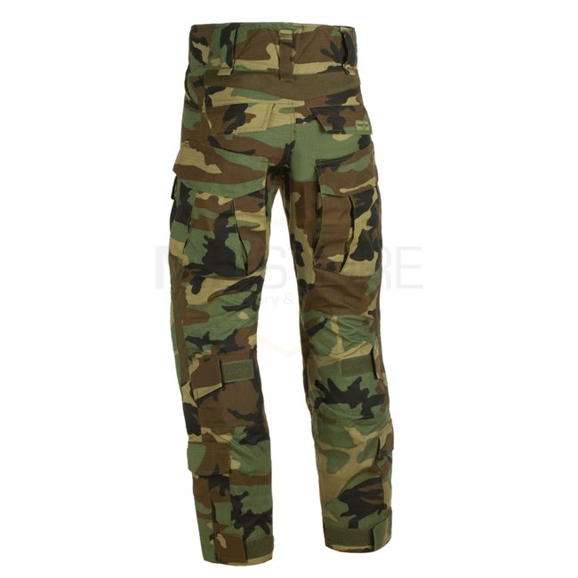 Pantalon de combat Invader Gear Predator en Woodland XS, pesant 870g. Inclut un tableau des tailles à titre de référence.