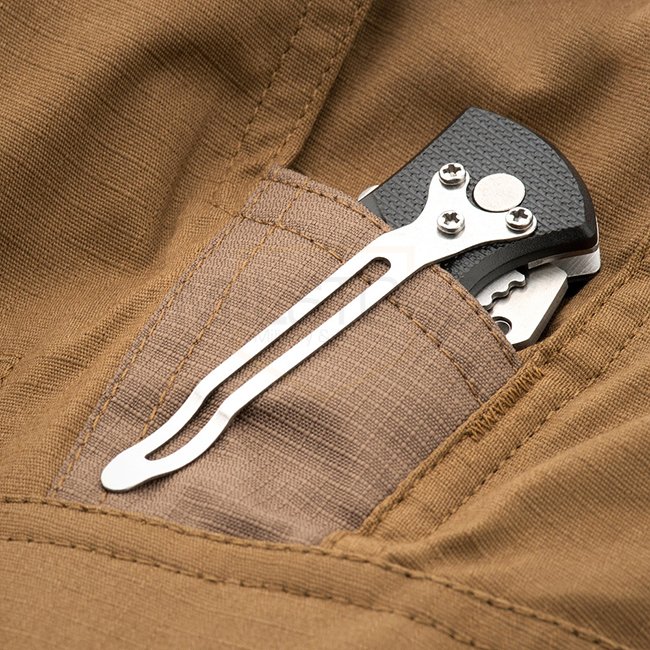 Les pantalons sont faits d'un matériau lisse et léger avec une imprégnation en téflon qui protège contre l'eau et la saleté. Le mélange de polyester et de coton est agréable sur la peau, conserve bien la couleur et est très résistant. L'idée principale lors de la création de ces pantalons était de maintenir le confort de mouvement - les concepteurs ont parfaitement maîtrisé cette tâche - les pantalons donne une impression de légèreté, ne limite pas les mouvements et a l'air élégant et solide. Le modèle a des poches confortables et larges avec des inserts renforcés. Le pantalon est conçu pour être porté avec une ceinture jusqu'à 5,5 cm de large. Des accessoires YKK de haute qualité ont été utilisés.