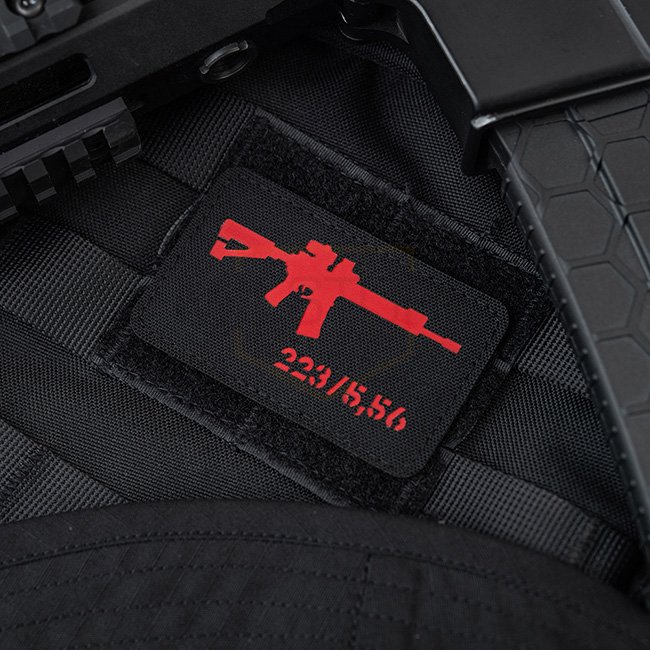 M-Tac AR-15 223/5.56 Écusson Découpe Laser - Rouge : Front en Nylon Cordura 500D durable et surface arrière à crochets. Dimensions 80 x 50 mm.
