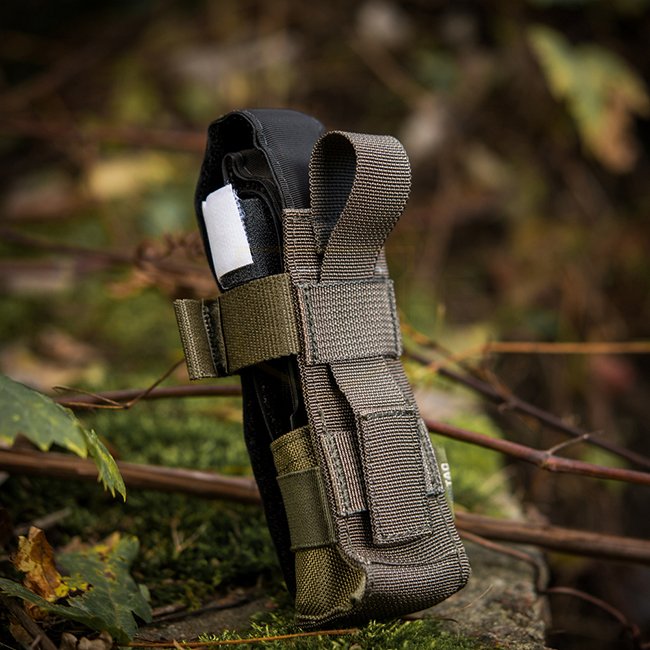 Afin de tenir dans la pochette, le garrot d'application de combat doit être plié en position "escargot". Le système de fixation modulaire vous permet d'installer la pochette sur des surfaces MOLLE, ainsi que sur des gilets et des ceintures.