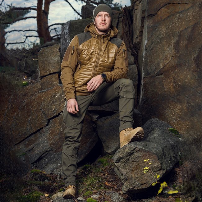 Les caractéristiques de conception du pantalon Conquistador Flex sont un insert élastique à la taille et près des poches latérales, grâce auquel le pantalon ne vous limite pas lorsque vous vous penchez ou vous penchez. Ils n'entravent pas la liberté de mouvement et vous pouvez les porter aussi bien comme vêtements tactiques que comme vêtements de tous les jours. Le pantalon a une fermeture éclair et un bouton, il est également équipé de passants pour une ceinture jusqu'à 5,5 cm de large. Deux anneaux en D sont cousus à l'avant pour attacher divers équipements. Le pantalon Conquistador Flex est équipé d'un grand nombre de poches, à la fois utilitaires et spéciales : il y a huit poches au total. Les poches latérales standard sont équipées d'un renfort en bas - pour attacher un clip de couteau ou une lampe de poche au bord de la poche. La poche cargo complexe est équipée d'une poche plaquée supplémentaire, qui peut accueillir un chargeur M4 ou AK. La poche cargo elle-même est assez spacieuse. Il a deux plis, grâce auxquels sa taille peut être augmentée pour transporter des objets volumineux. La poche cargo est fermée par un rabat velcro asymétrique à ouverture rapide. De plus, la poche cargo est équipée d'une deuxième entrée zippée, ce qui vous permet d'accéder à son contenu depuis une position assise.