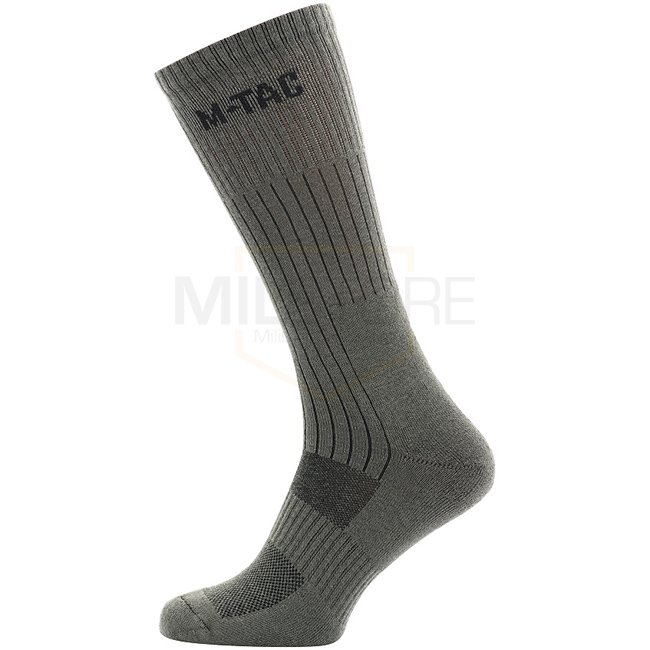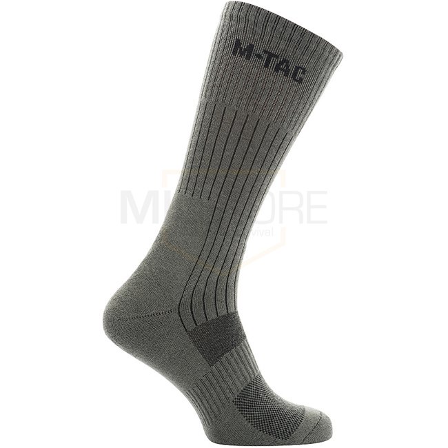 Les caractéristiques de conception des chaussettes hautes Mk.2 comprennent des zones spéciales d'absorption thermique et des chocs à l'avant-pied et au talon avec une transition vers le cou-de-pied, protégeant la cheville des entorses et des contraintes mécaniques. Pour améliorer les performances lors de marches intenses, un collier de voûte plantaire latéral a été ajouté pour éviter que la chaussette ne se plisse en bas. Le large revers répartit uniformément la charge pour maintenir la chaussette sur votre tibia. Toute la surface du pied est doublée d'un tissage éponge interne qui répartit uniformément la charge sur l'ensemble du pied. Les chaussettes de trekking avec des zones thermiques texturées absorbent la majeure partie de l'humidité et à travers les canaux de ventilation existants, les capillaires éliminent l'humidité à travers la tige de la chaussure. De plus, elles se combinent parfaitement avec les bottes à membrane, car le processus de transport de l'humidité vers l'extérieur est encore plus rapide.
