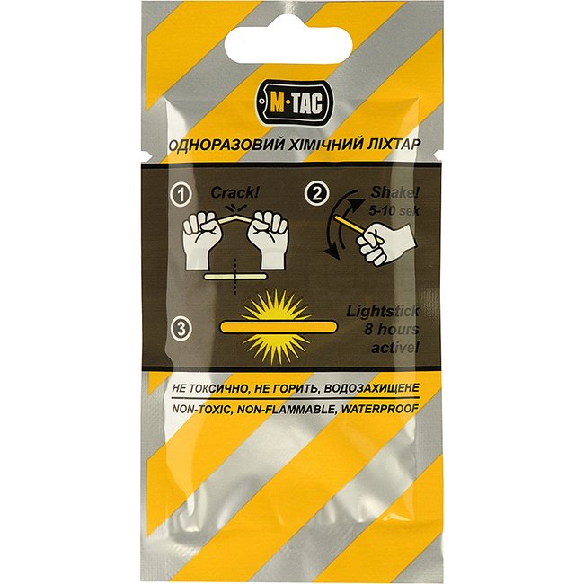 Le bâton lumineux M-Tac est une source lumineuse entièrement autonome qui fonctionne sans électricité et aide à éclairer les endroits sombres, à marquer un point ou à donner un signal. Le tube jetable peut éclairer une petite zone pendant 24 heures après activation. Les composants chimiques sûrs, non toxiques et ininflammables sont contenus dans un boîtier scellé et peuvent être stockés pendant une longue période sans perdre leurs propriétés. Il est largement utilisé dans la pratique militaire, la plongée et est également utilisé comme divers types d'éclairage de secours.
