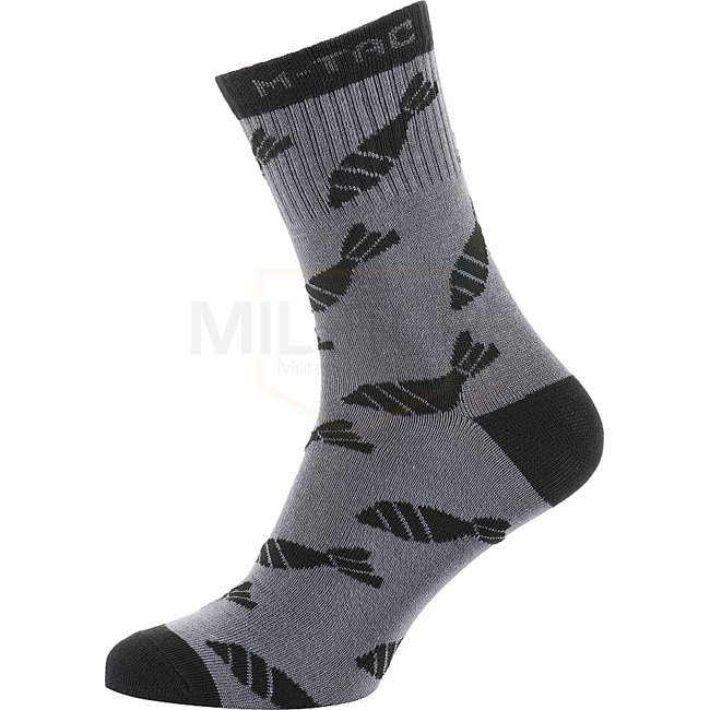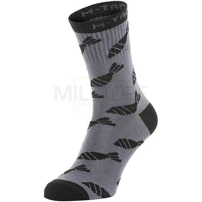 Chaussettes légères M-Tac Mortar Bombs Mk.3 - Gris foncé - 43-46 : Chaussettes légères et respirantes avec une thermorégulation optimale. La bande élastique serrée empêche de tourner ou de glisser. Motif original et forme anatomique pour le confort. Parfa